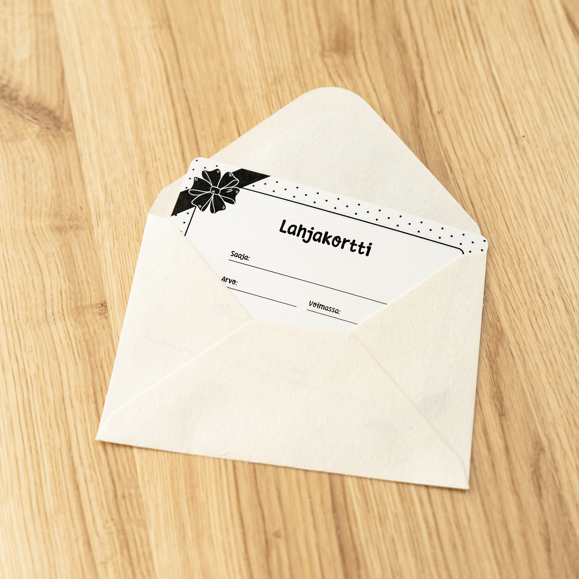 Laadukkaalle ja paksulle Fine Art -paperille tulostettu lahjakortti. Valittavissa sileä sekä tekstuuripaperi. Toimitetaan ostajan omaan osoitteeseen kirjepostissa tai vastaanottajalle suoraan postiluukkuun. Lahjakortti toimitetaan siistissä kirjekuoressa joka on pahvisen kirjelaatikon sisällä. Kortin voi ostaa valmiiksi täytettynä tai sen voi täyttää halutessaan itse käsin.